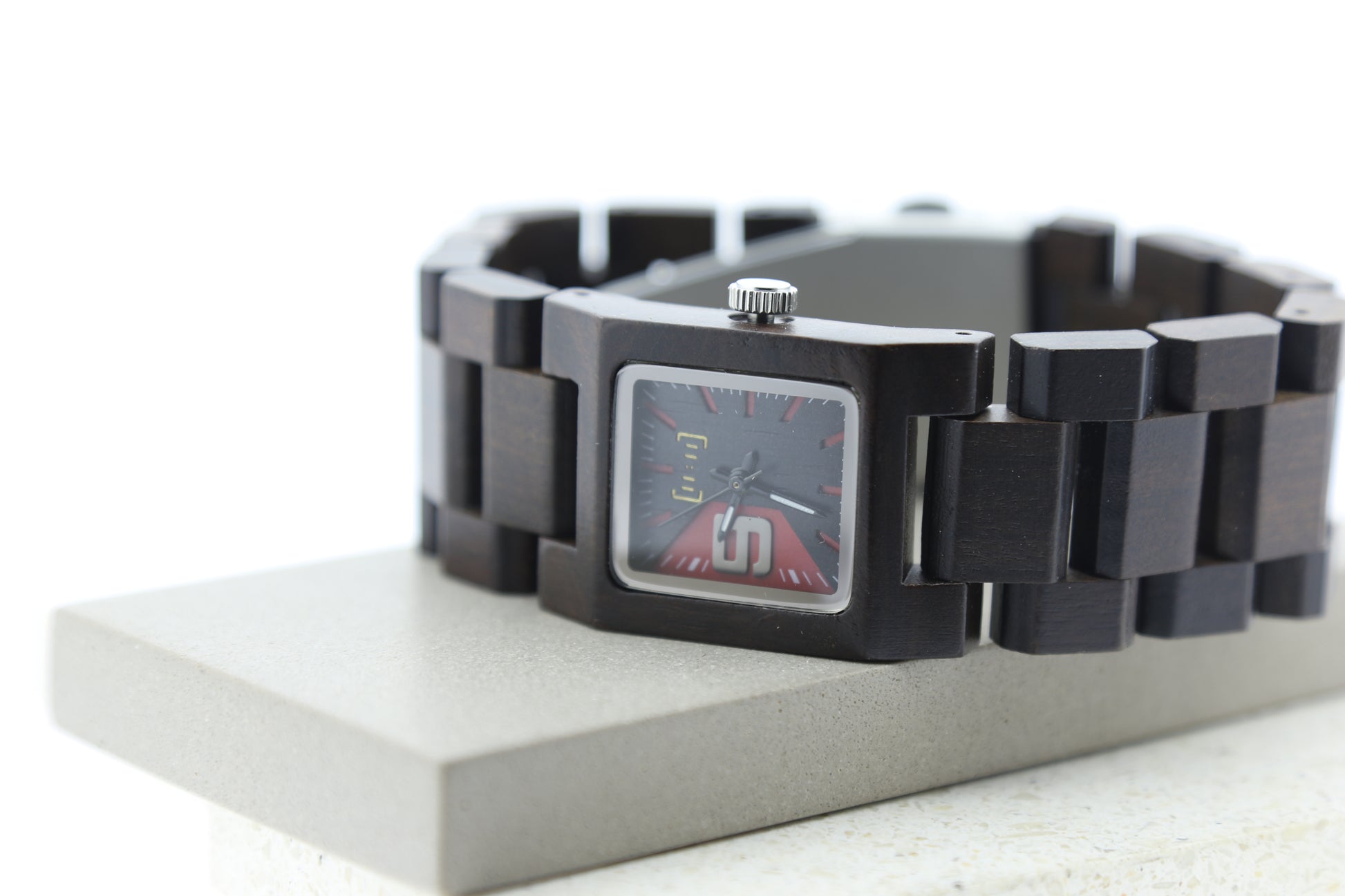 Su carátula negra con acentos rojos aporta contraste y carácter, mientras que la correa de eslabones anchos de madera garantiza comodidad y un ajuste natural al contorno de la muñeca.